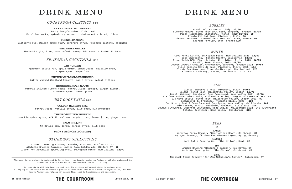 The Courtroom embodies casual, flexible dining at its finest. We invite you to enjoy a drink and a bite in our cozy lounge or savor a full meal with friends at the heart of the community.